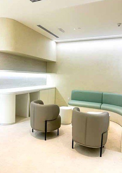 After third-party damage, walls were fully re-executed to achieve seamless, joint-free surfaces and a consistent custom color system throughout the clinic.